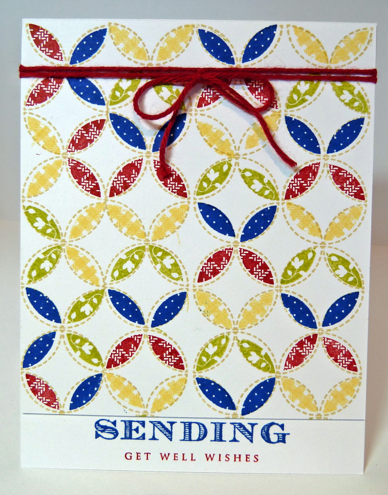 Isn't that a pretty scene?  I was inspired by the colors and.... my brand new Quilt Prints stamps, and my need for a get well card.  This is such a cozy pattern, and I think it is perfect for a get well card.